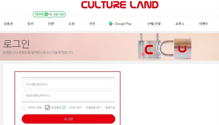 컬쳐랜드 홈페이지에 접속해서 로그인을 진행해 주세요. 아이디가 없으시다면 회원가입을 진행해 주세요.